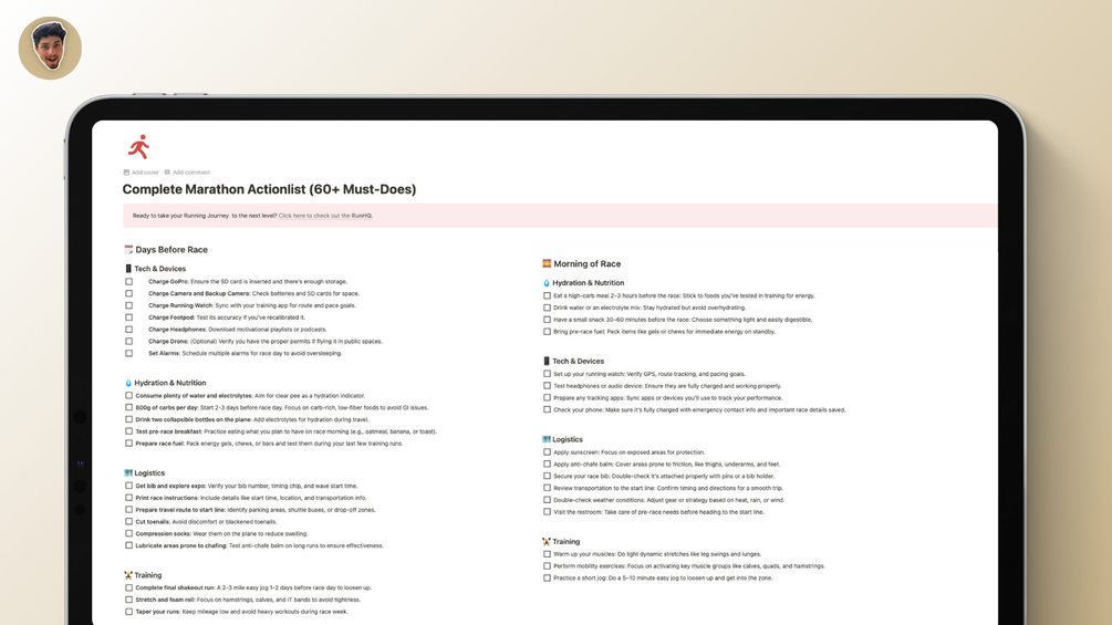The Complete Marathon Checklist is your go-to resource for success in any race. It provides all the necessary to-dos for preparation, execution, and recovery to achieve new personal bests and crush each race effortlessly.