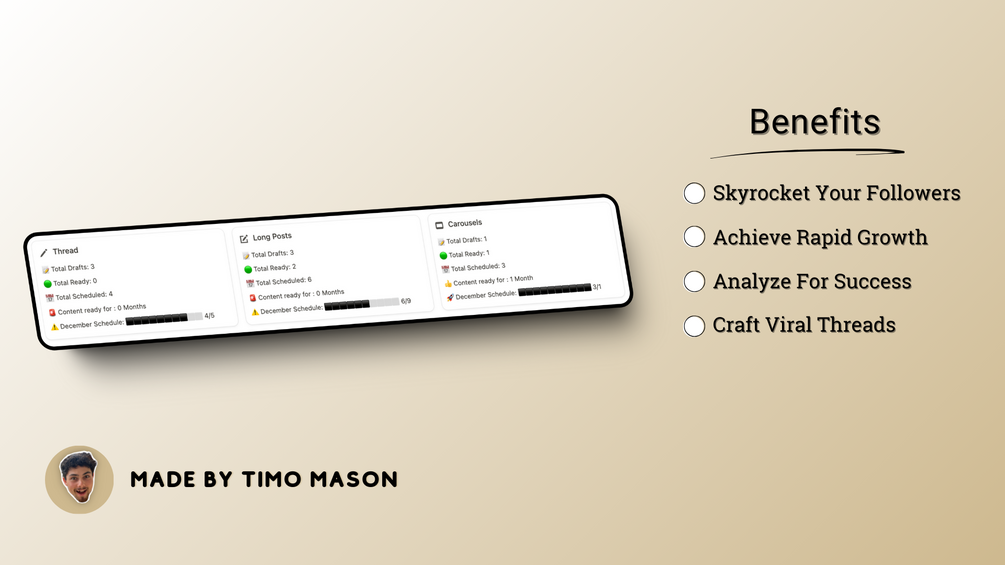I’m Timo Mason, a content creator and Notion expert passionate about building tools that help creators stay organized and productive.