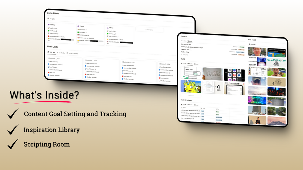An all-in-one system to simplify content ideation, creation, planning, and scheduling on TikTok from one unified dashboard in Notion.