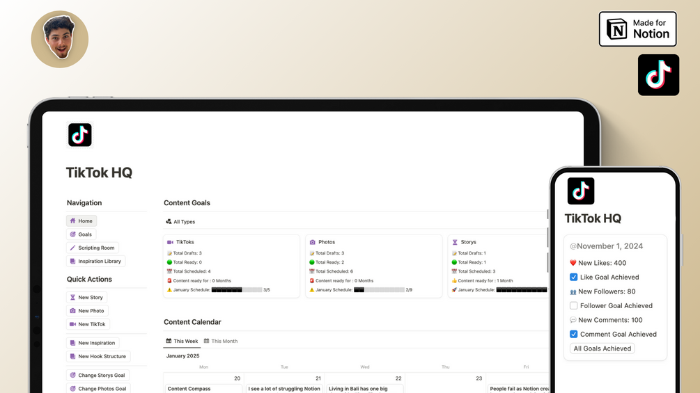 An all-in-one system to simplify content ideation, creation, planning, and scheduling on TikTok from one unified dashboard in Notion.