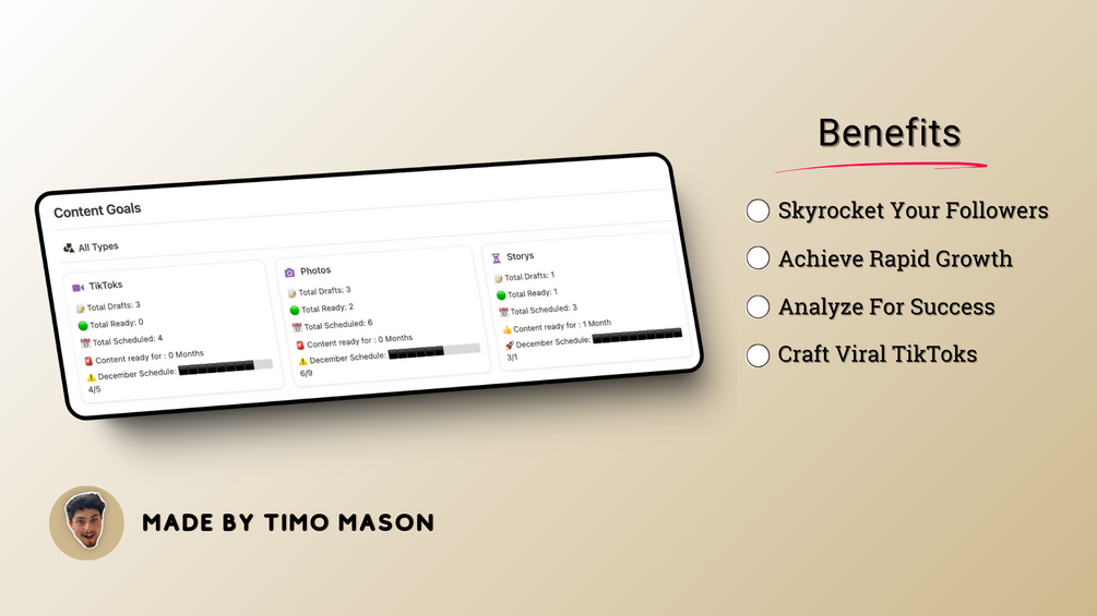 I’m Timo Mason, a content creator and Notion expert passionate about building tools that help creators stay organized and productive.