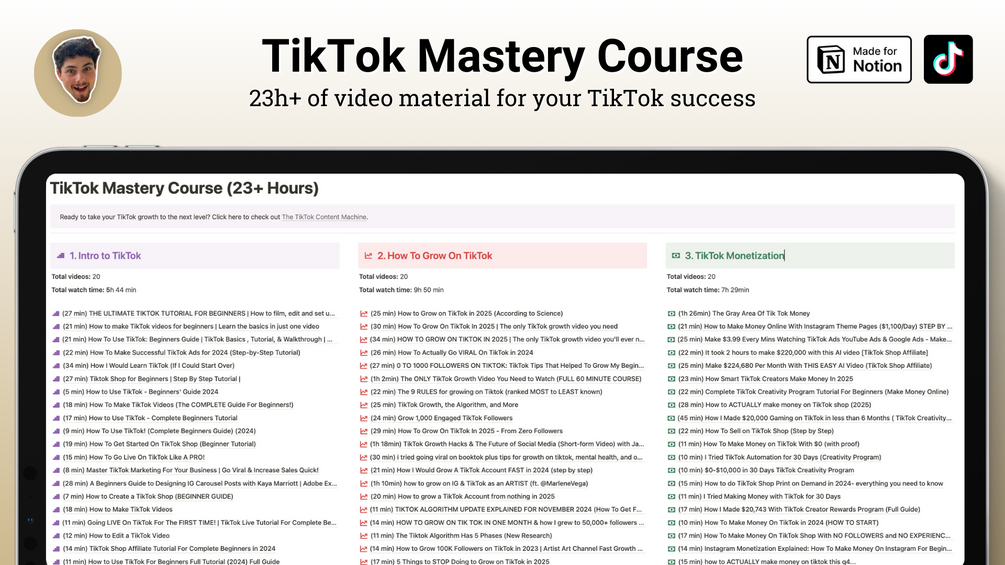 The TikTok Mastery Course is your go-to resource for TikTok success. It provides all the inspiration, frameworks, and strategies you need to grow your audience, boost engagement, and effortlessly build your personal brand.