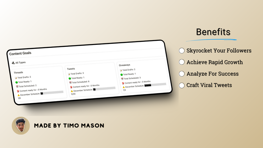 I’m Timo Mason, a content creator and Notion expert passionate about building tools that help creators stay organized and productive.