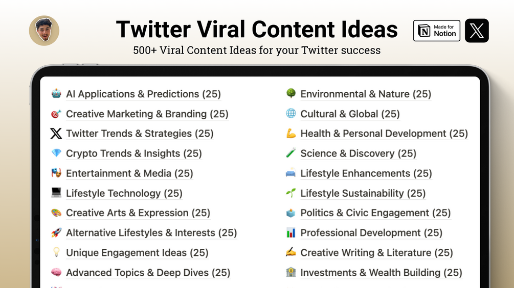This collection is your go-to resource for Twitter success. It provides all the inspiration, frameworks, and strategies you need to grow your audience, boost engagement, and effortlessly build your personal brand.