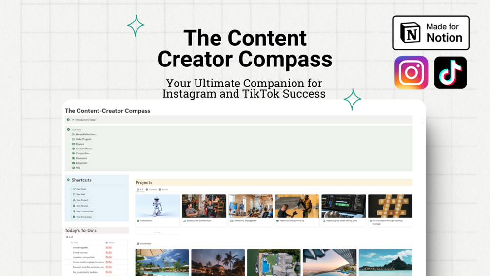 Boost your productivity and unleash your creativity with the Content-Creator Compass. Start today and transform your Instagram and TikTok content creation experience!